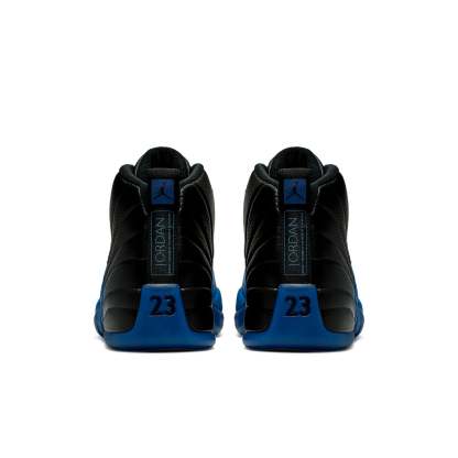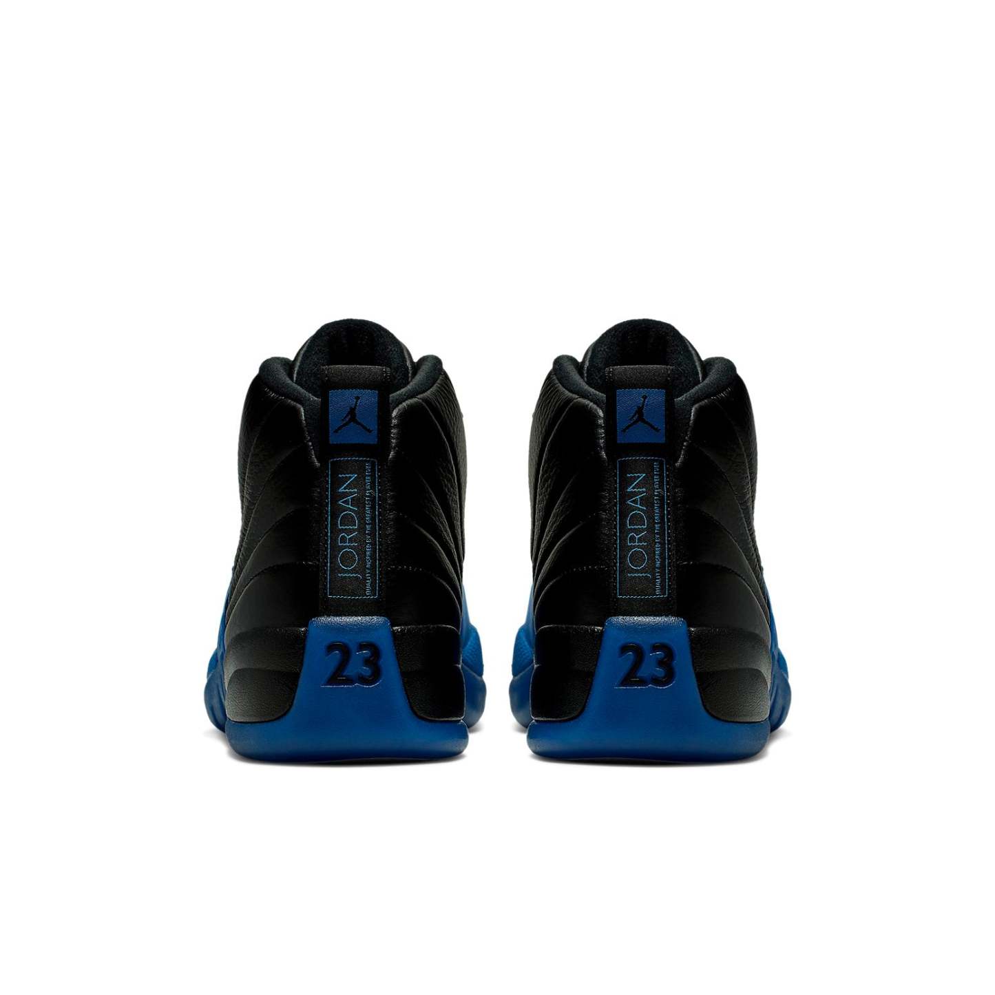 Nike Air Jordan 12 Retro Game Royal dressed in a black and Game Royal color scheme. Black rope laces, matching leather tongue with blue accents on the 'Two 3' text and Jumpman logo. Further details includes Jordan branding on the heel tab and heel spine with a black '23' logo on the blue rubber midsole.
